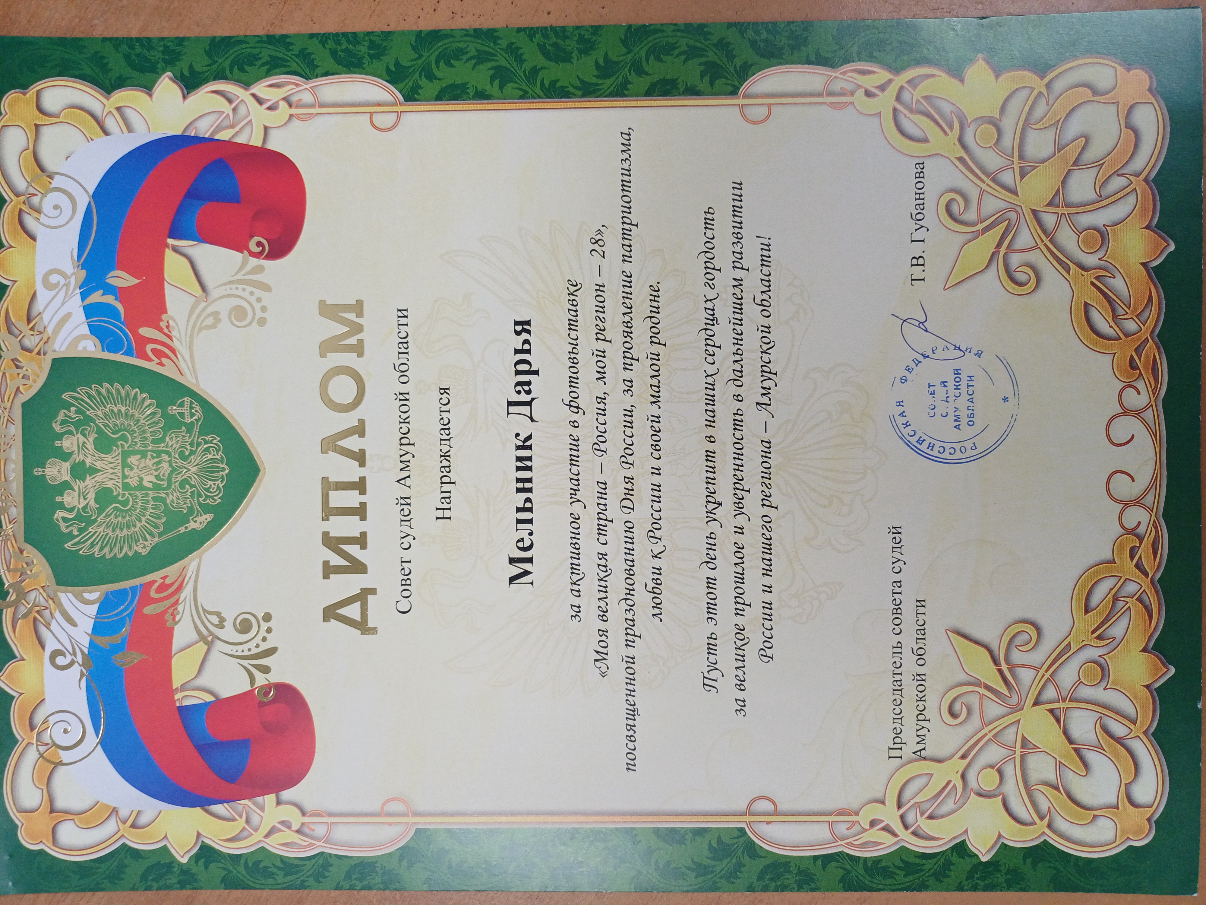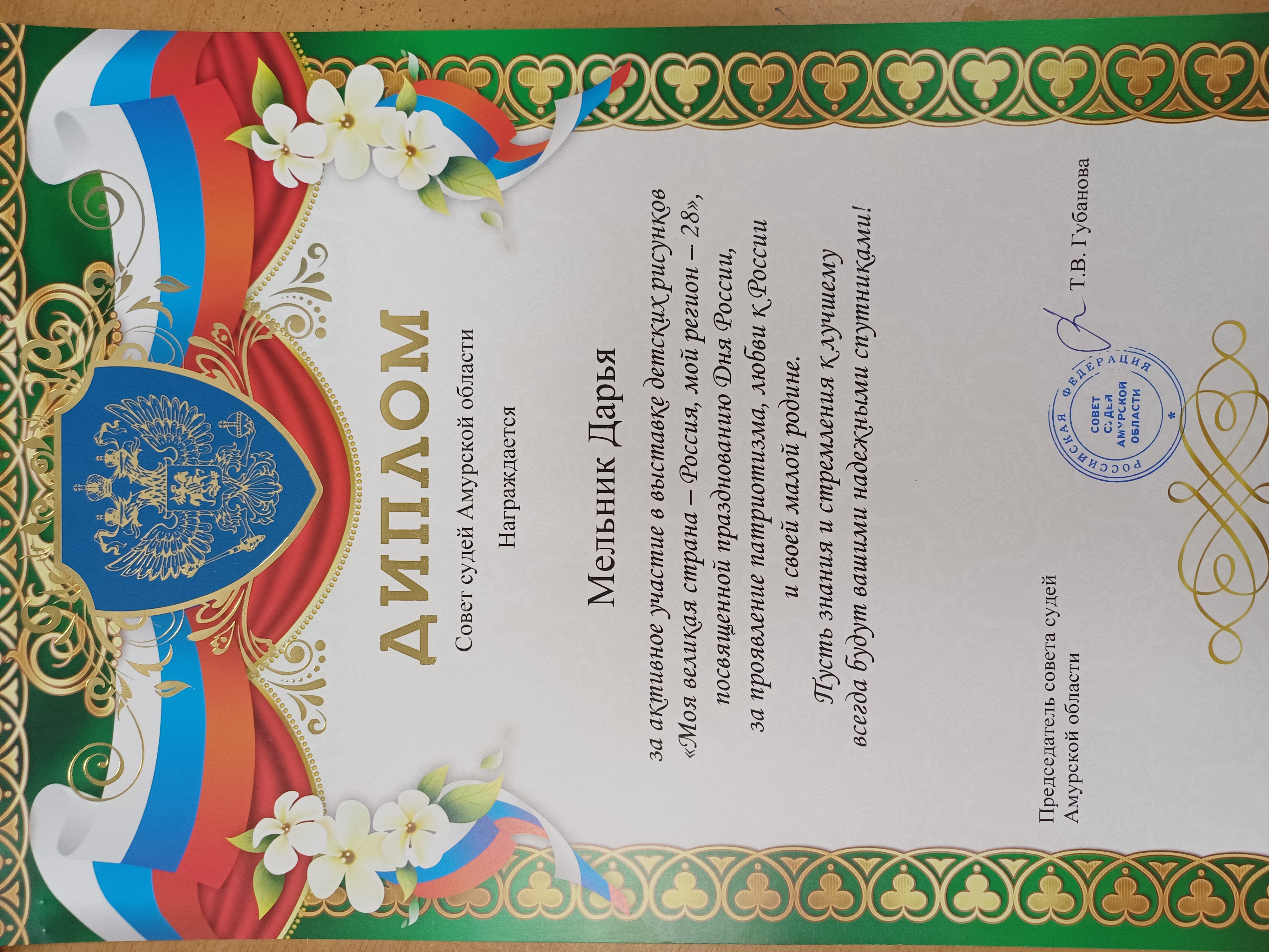 В канун празднования одной из самых значимых для нашей страны дат - День России - состоялась виртуальная выставка фотографий и детских рисунков под названием «Моя великая страна-Россия, мой регион-28». Организатором выставки были Совет судей Амурской области, Амурский областной суд, Амурское отделение Российского объединения судей, Управление Судебного департамента в Амурской области. От Магдагачинского районного суда в конкурсе приняла участие Мельник Дарья. Она представила на конкурс три фотографии под названием «Плотина», «Одуванчики», «Памятник герою Советского Союза М.Т.Курбатову», а также рисунок под названием «Плотина». Даша учится в МАУДО «Магдагачинская школа искусств», является постоянным участником различных творческих конкурсов, занимает призовые места.По итогам выставки Дарья отмечена Дипломом участника. ![]() ![]() ![]() ![]() ![]() ![]() |
