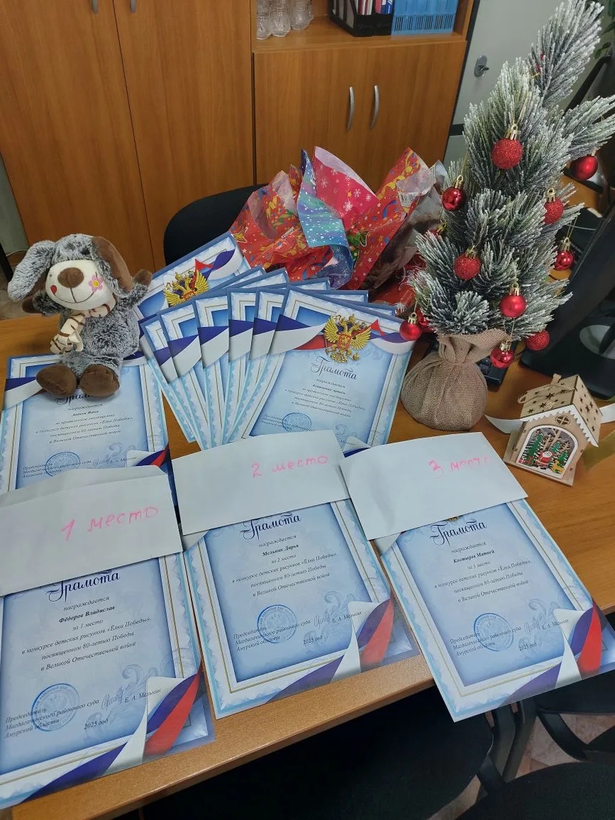В начале декабря среди детей сотрудников Магдагачинского районного суда был объявлен конкурс детских рисунков «Елка Победы 1945 года». Конкурс был приурочен к 80 годовщине Победы в Великой Отечественной войне. В конкурсе участвовали Николаев Родион, Грибельная Ева, Мельник Дарья, Верба Таисия, Алипченко Артем, Кузнецов Кирилл, Шаталова София, Федоров Владислав, Евграфова Марьяна, Авдеев Иван, Костырев Матвей. Ребята очень старались, рисунки получились трогательные, нежные… 23 декабря жюри определило победителей. Критериями оценки рисунков, в первую очередь, были соответствие тематике, оригинальность и мастерство конкурсантов. За соответствие тематике конкурса первое место занял Федоров Владислав, второе место у Мельник Дарьи, третье место у Костырева Матвея. В номинации «Мастерство» жюри оценило работы Алипченко Артема, Шаталовой Софии и самого маленького нашего художника двухлетнего Авдеева Вани. За участие в конкурсе ребята получили сладкие призы, грамоты и мягкие игрушки. Поздравляем юных художников и желаем им творческих успехов!![]() ![]() ![]() |